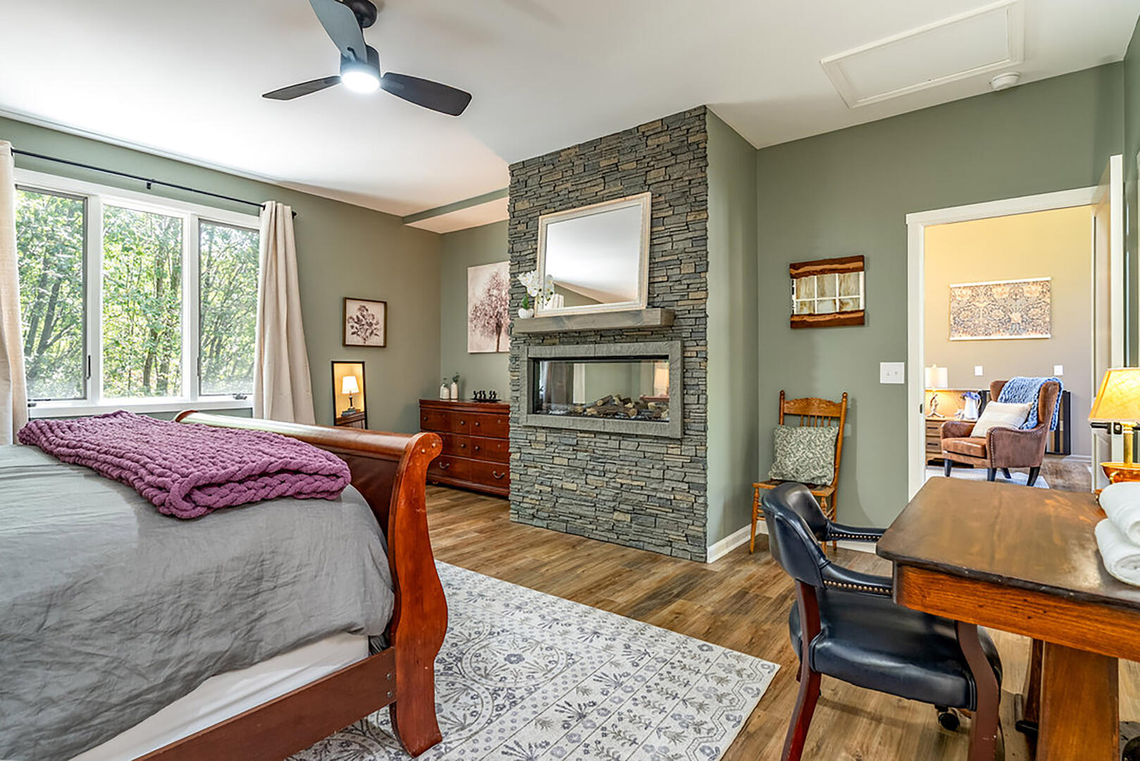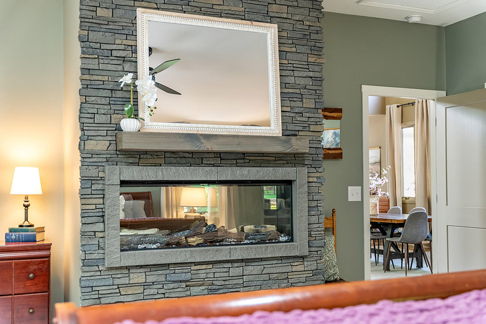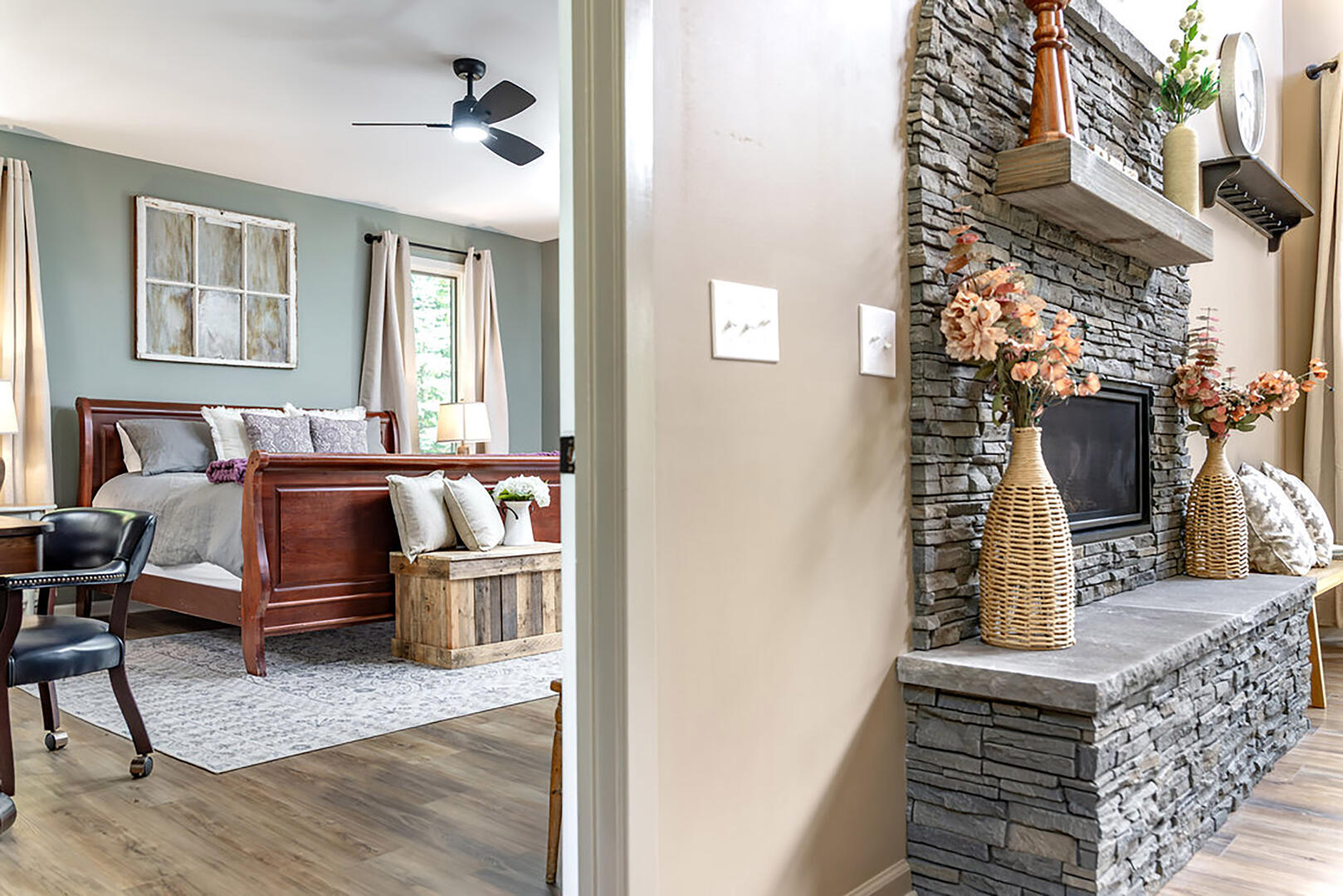 Bedroom 2: Main level, king bed, ensuite bath, electric fireplace