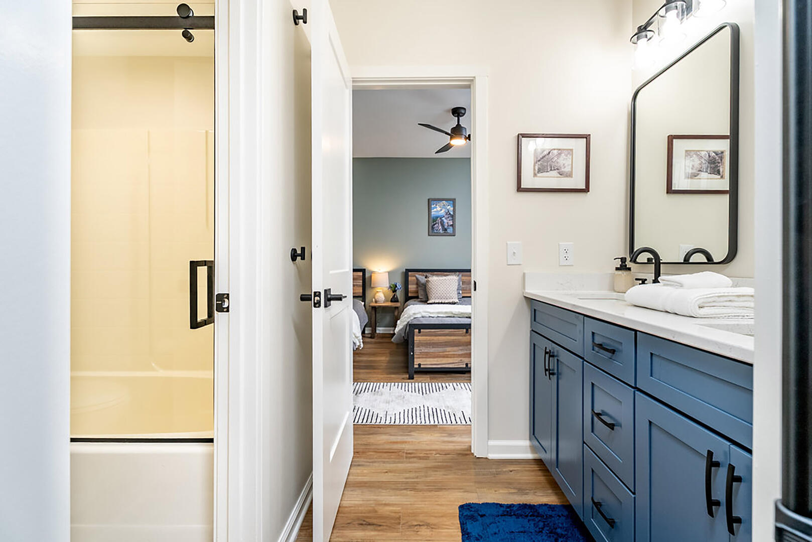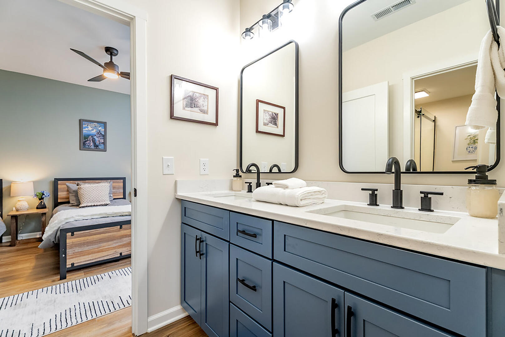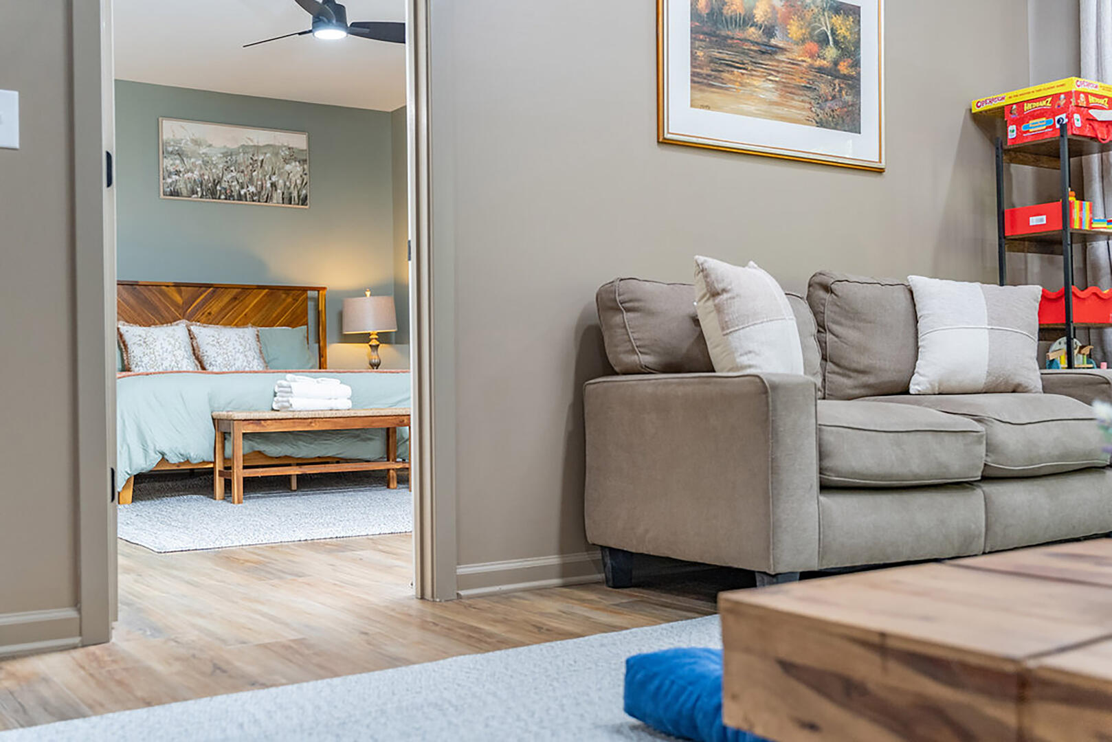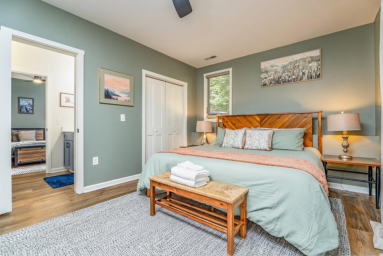 Bedroom 2: Main level, king bed, ensuite bath, electric fireplace