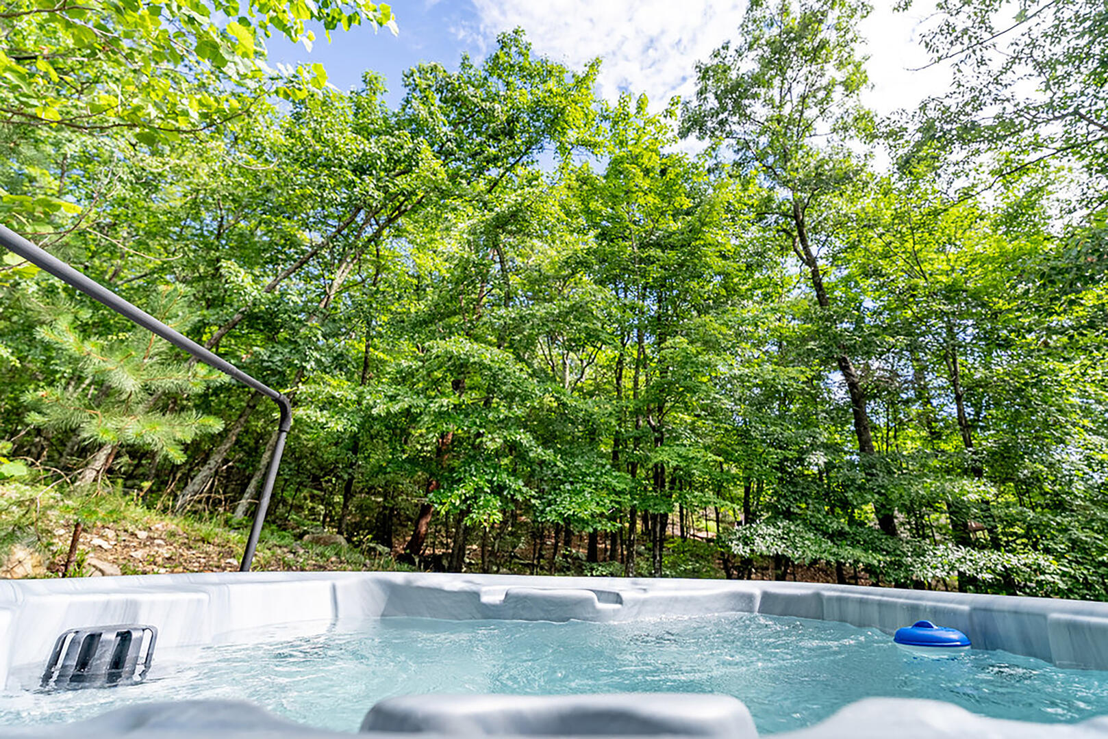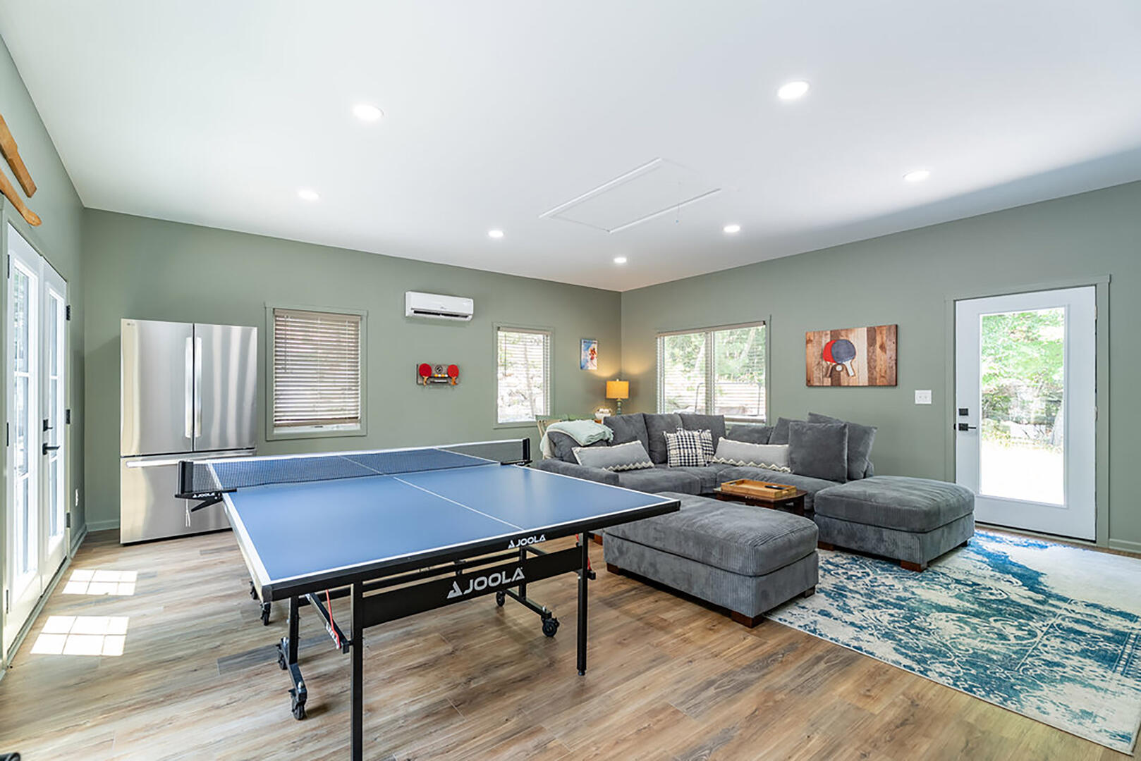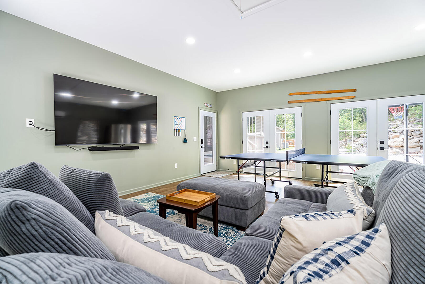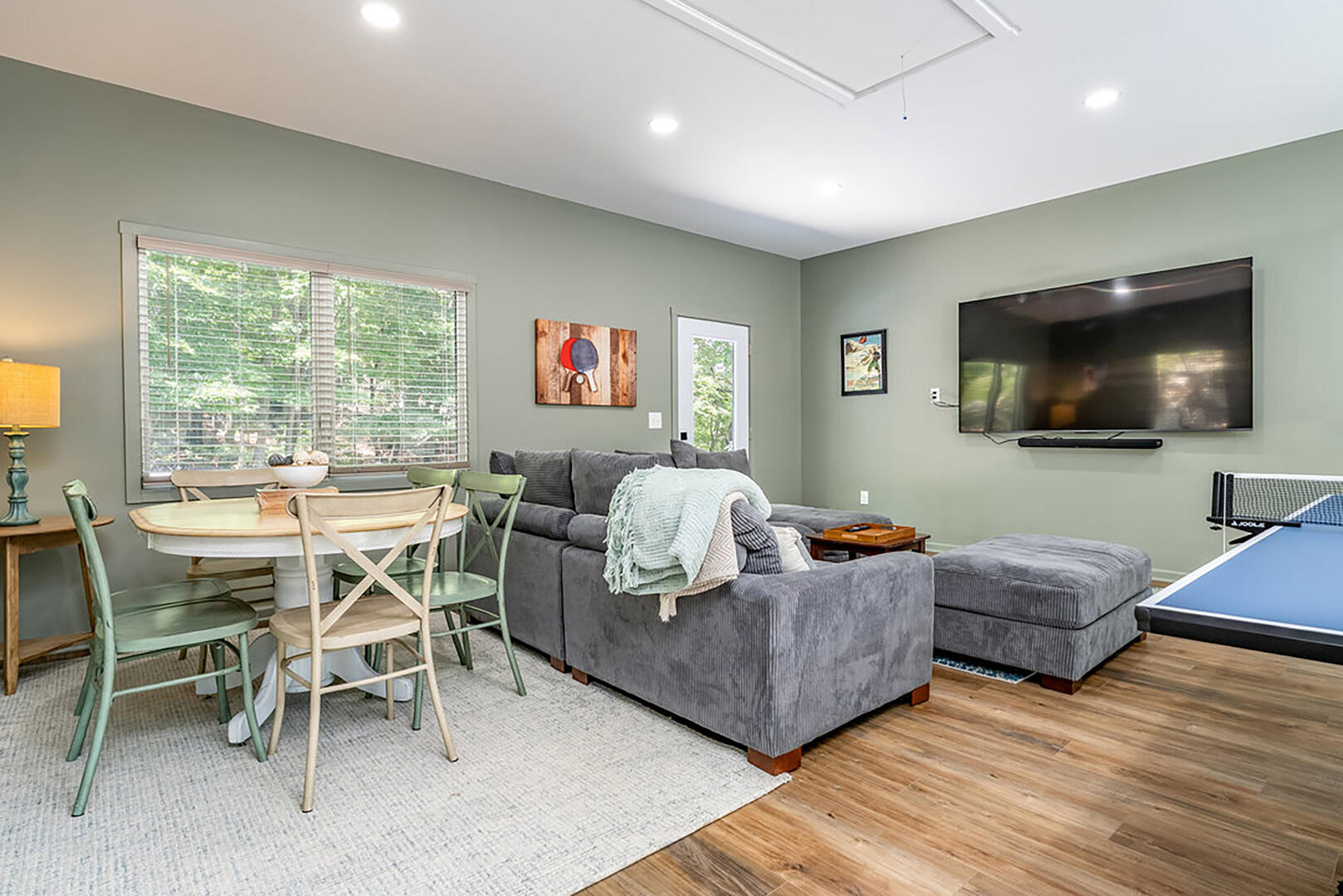 For cozy entertainment, head downstairs to the basement living room where a large TV invites laid-back movie nights. Even more excitement awaits in the separate Rec Room, complete with a very large TV—perfect for epic game days or fun-filled movie marathons—and a ping pong table for friendly competition. Step into the hot tub and melt into forest views as you soak under the sky. Whether it's morning mist or a canopy of stars, this is your moment to relax deeply and breathe freely.