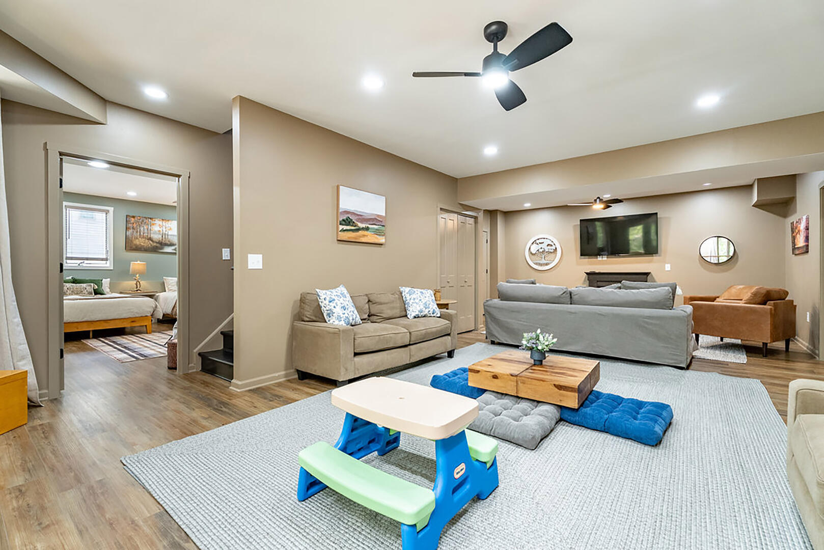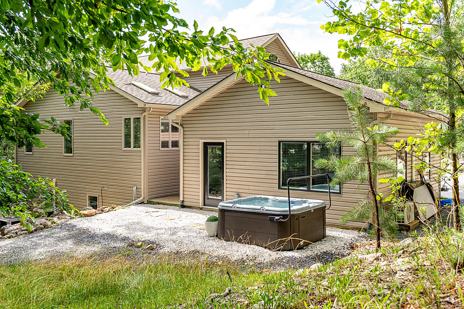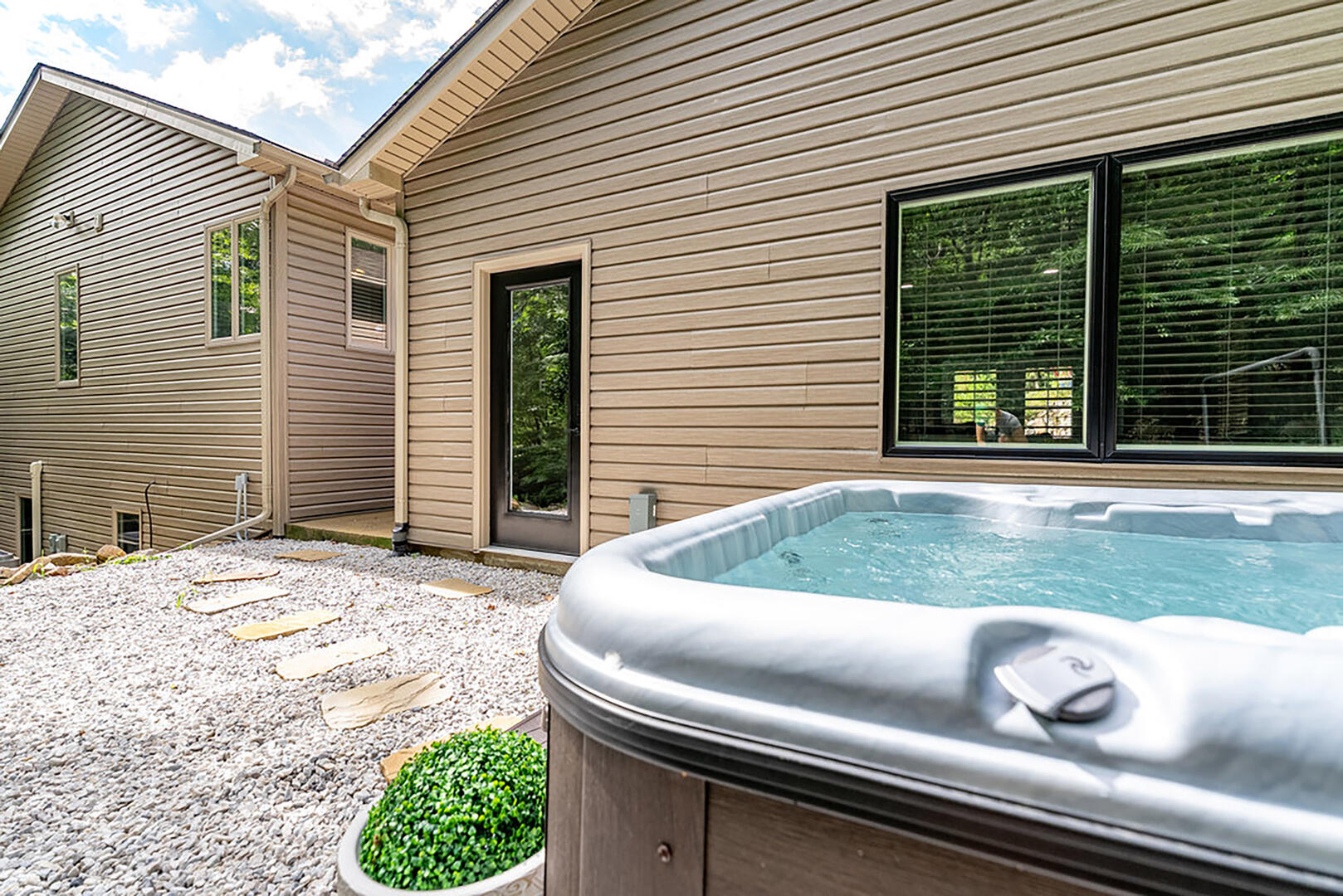 For cozy entertainment, head downstairs to the basement living room where a large TV invites laid-back movie nights. Even more excitement awaits in the separate Rec Room, complete with a very large TV—perfect for epic game days or fun-filled movie marathons—and a ping pong table for friendly competition. Step into the hot tub and melt into forest views as you soak under the sky. Whether it's morning mist or a canopy of stars, this is your moment to relax deeply and breathe freely.